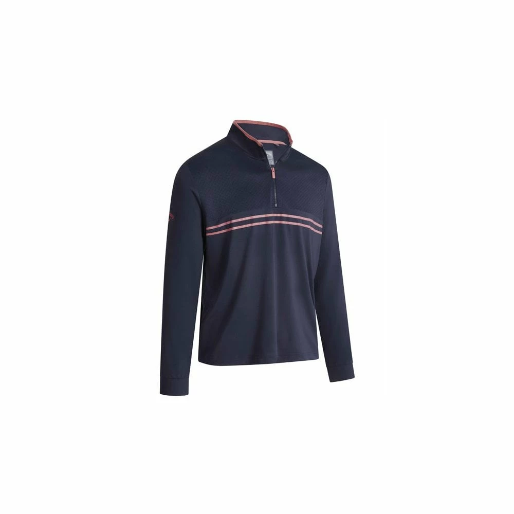 Callaway men’s textured print pullover is a quarter zip design that is easy to put on and take off out on the golf course. This top features Swing Tech technology which allows you to move freely in all directions. Stylish chest stripe design with contrasting chest material plus thermal properties for added comfort. The Callaway branding makes this an ideal garment for both on and off the course.