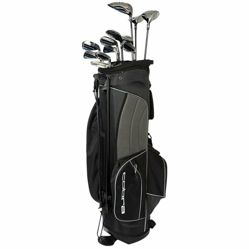 The men’s Cobra FLY-XL complete set includes a full bag of lightweight and forgiving clubs that deliver easy launch and distance for the beginner or aspiring golfer. The 10 piece set includes a driver, fairway wood, irons, hybrid, blade putter, and a cart bag.