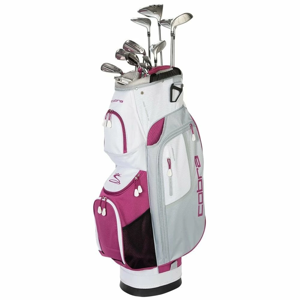 The women’s Cobra FLY-XL complete set includes a full bag of lightweight and forgiving clubs that deliver easy launch and distance for the beginner or aspiring golfer. The 13 piece set includes a driver, fairway woods, hybrid, mallet putter, and a cart bag.