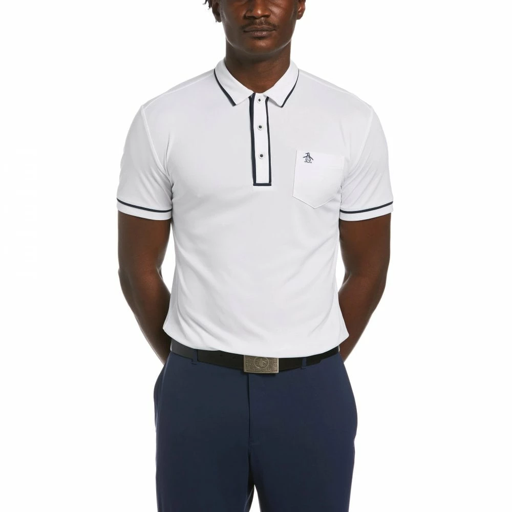 Get your A-game on and look good doing it in The Performance Earl⢠Polo from Original Penguin. This sleek polo is crafted from a double-knit high-gauge dobby fabric for texture and durability. Contrast tipping at the collar and contrast piping on the cuffs and placket add sophisticated styling. Two-tone Pete embroidery pops on the handy left chest pocket of this short sleeve polo shirt.